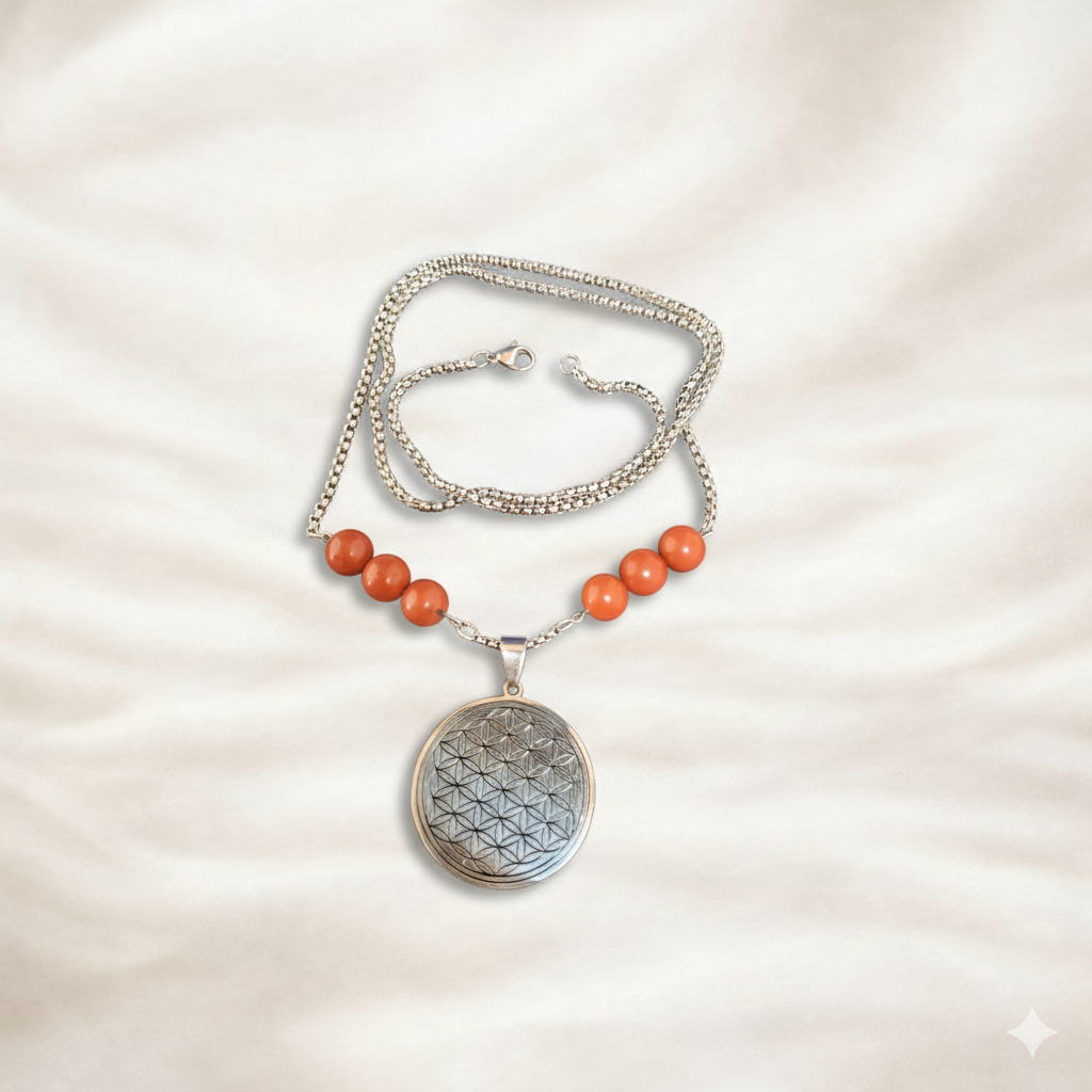 Collier fleur de vie en acier inoxydable avec perles en Jaspe rouge